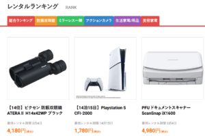 幅広いジャンルのアイテムをレンタル可能:カメラ・スマホ・パソコン・旅行用品・生活家電・美容家電・アウトドア用品など。用途に応じて選べます。